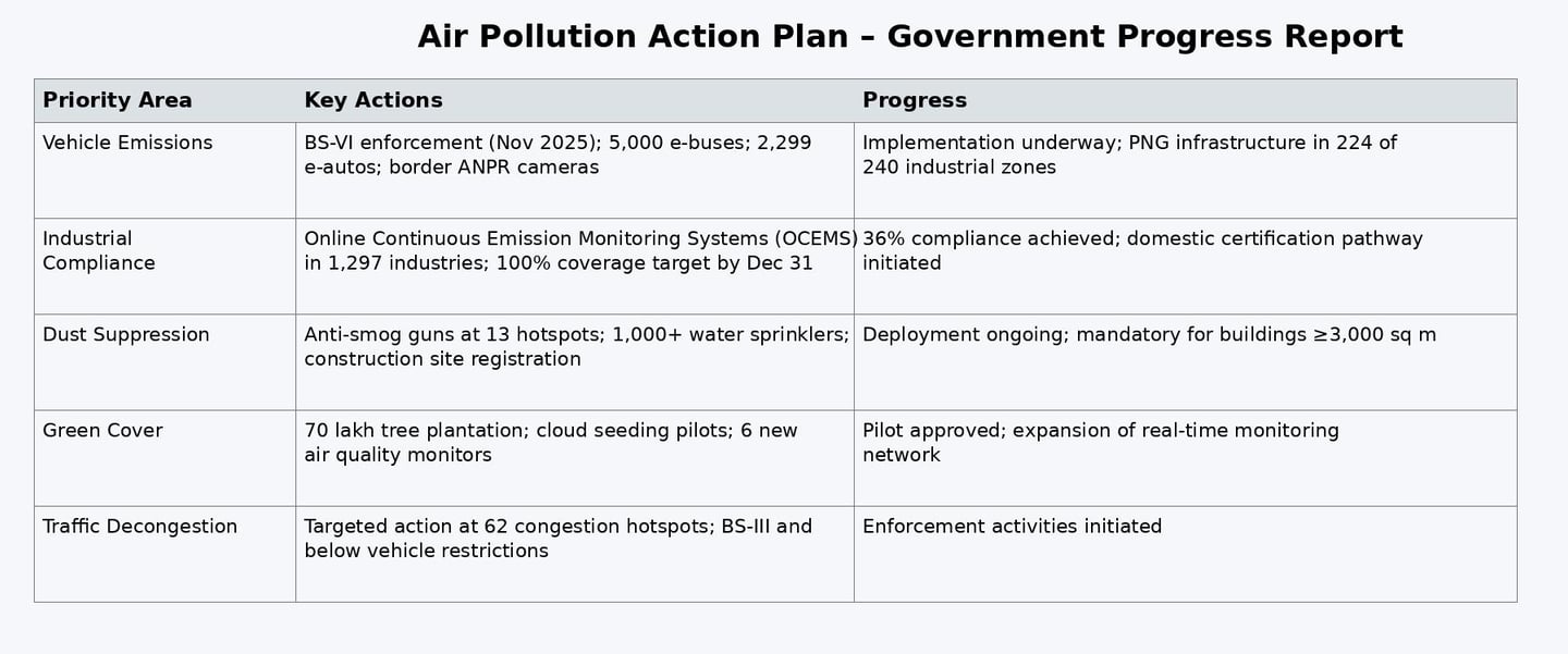 In June 2025, Chief Minister Rekha Gupta launched a comprehensive Air Pollution Mitigation Plan addressing the complex sources of Delhi's air crisis. The approach spans five critical areas: